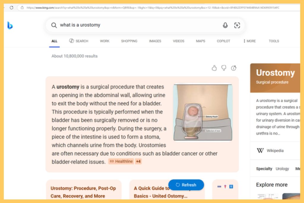 Additionally, AI is currently very US centric. For example, the four links at the bottom of the Bing example, all link to American resources, rather than UK ones. The danger here is that services and support for urostomates in the UK are different to the US, particularly when it comes to the NHS and sourcing supplies.