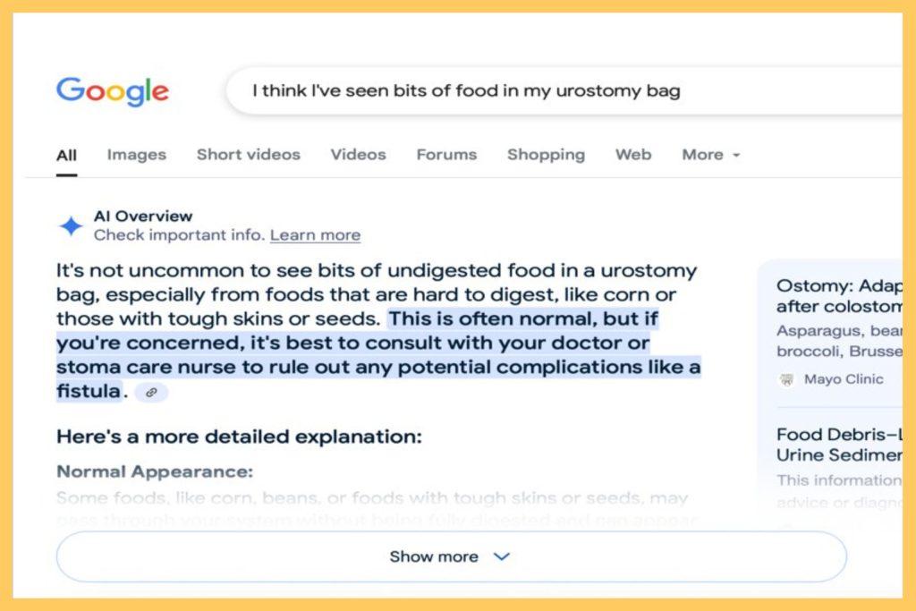 And the answers can be confusing, incorrect, and worrying. The picture below shows an AI generated response from Google to the statement ‘I think I’ve seen bits of food in my urostomy bag’. The answer suggests that seeing undigested food in your urostomy bag is not uncommon when, in fact, it is. This response actually relates to people with colostomy bags.